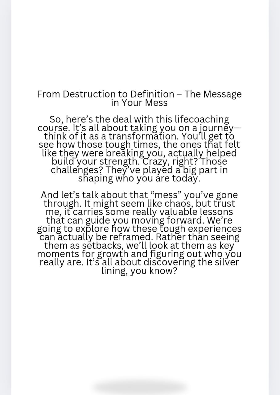 Be the first to review “Life Coaching Course: From destruction to definition – The message in your mess”